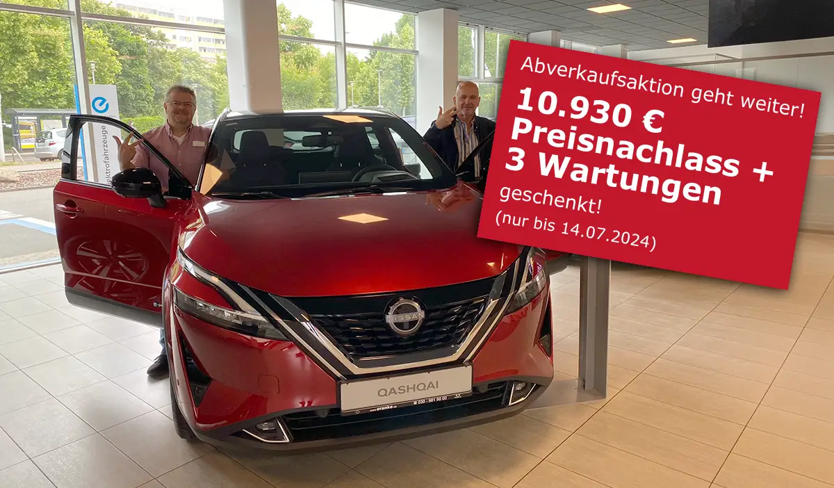 Unsere große Abverkaufsaktion für den Nissan Qashqai geht in die nächste Runde – und wir legen noch einen drauf! Jetzt entscheiden und sparen: