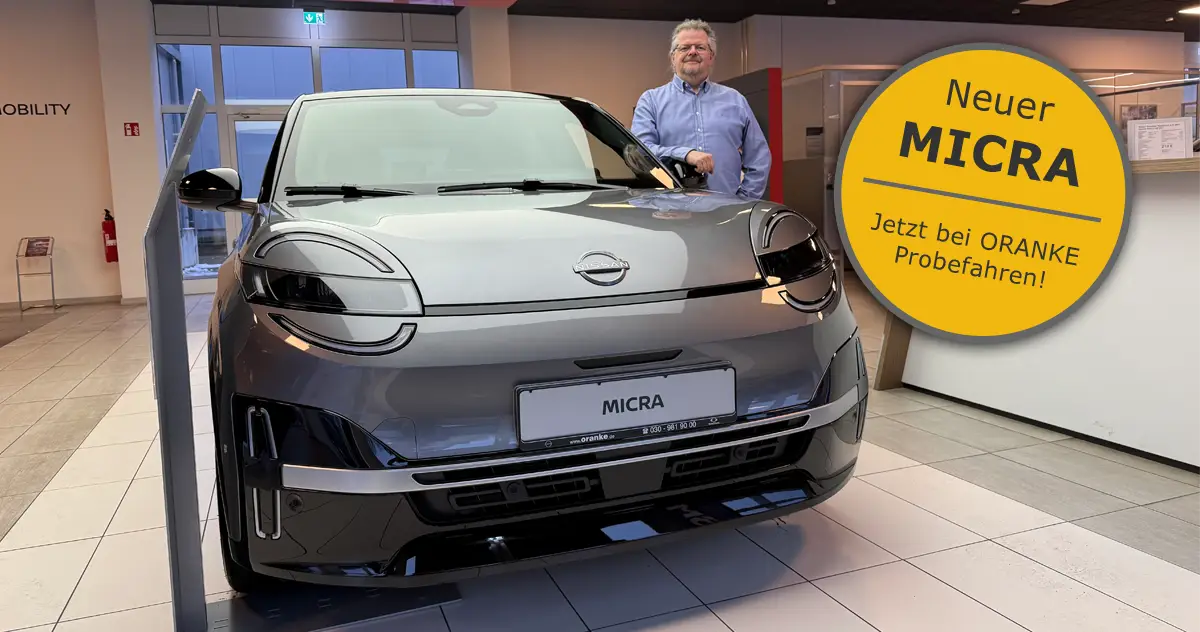 Der neue Nis­san MI­CRA ist da – und kann ab so­fort bei uns im Auto-Treff Oran­ke Pro­be ge­fah­ren wer­den. Un­ser E‑­Mo­bi­li­täts-Pro­fi Kars­ten Zo­bel be­rät Sie gern per­sön­lich. Ver­ein­ba­ren Sie jetzt Ihre Pro­be­fahrt oder kom­men Sie ein­fach vor­bei – wir freu­en uns auf Ih­ren Be­such.