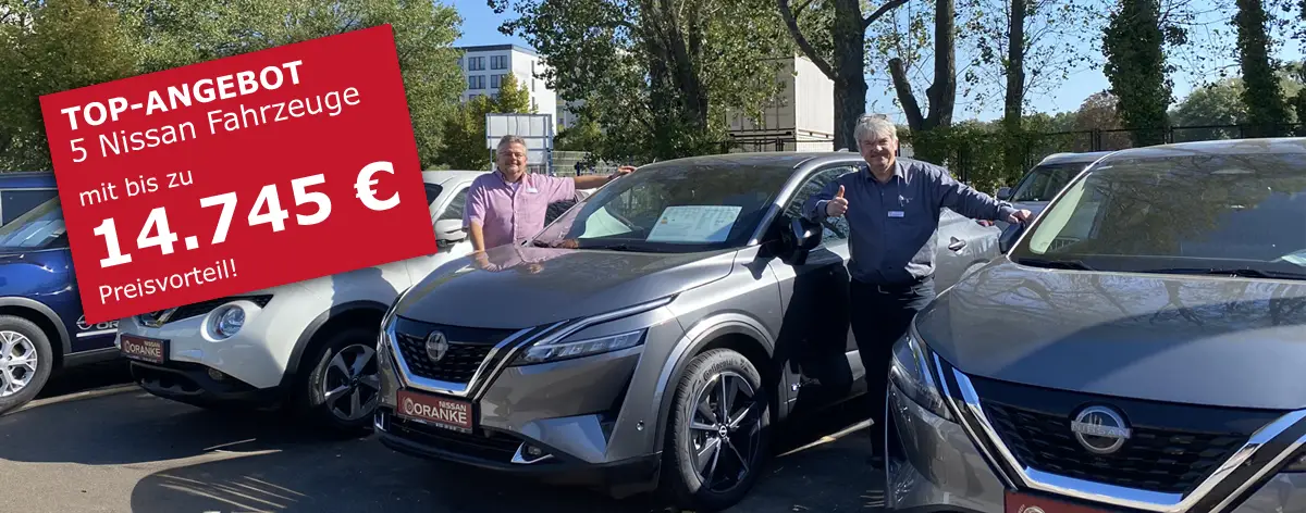 Nut­zen Sie jetzt Ihre Chan­ce und si­chern Sie sich ei­nes von fünf Nis­san-Mo­del­le zu un­schlag­ba­ren Kon­di­tio­nen! Wir ha­ben zwei top aus­ge­stat­te­te Nis­san X‑Trail und drei Nis­san Qas­h­qai im Ab­ver­kauf – mit Preis­vor­tei­len von bis zu 14.745 €! At­trak­ti­ve Fi­nan­zie­rungs­kon­di­tio­nen sind auf An­fra­ge eben­falls ver­füg­bar. War­ten Sie nicht zu lan­ge! Die­se An­ge­bo­te gel­ten nur so­lan­ge der Vor­rat reicht.