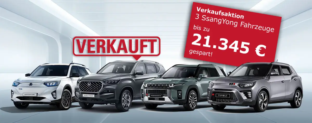 Wir möchten Sie daran erinnern, dass unsere Abverkaufsaktion für die beliebten SsangYong-Modelle weiterläuft – aber die Zeit wird knapp! Der Rexton ist bereits verkauft. Es stehen noch 3 Top-Fahrzeugen für Sie bereit: je ein Korando e‑Motion, Torres und Tivoli!