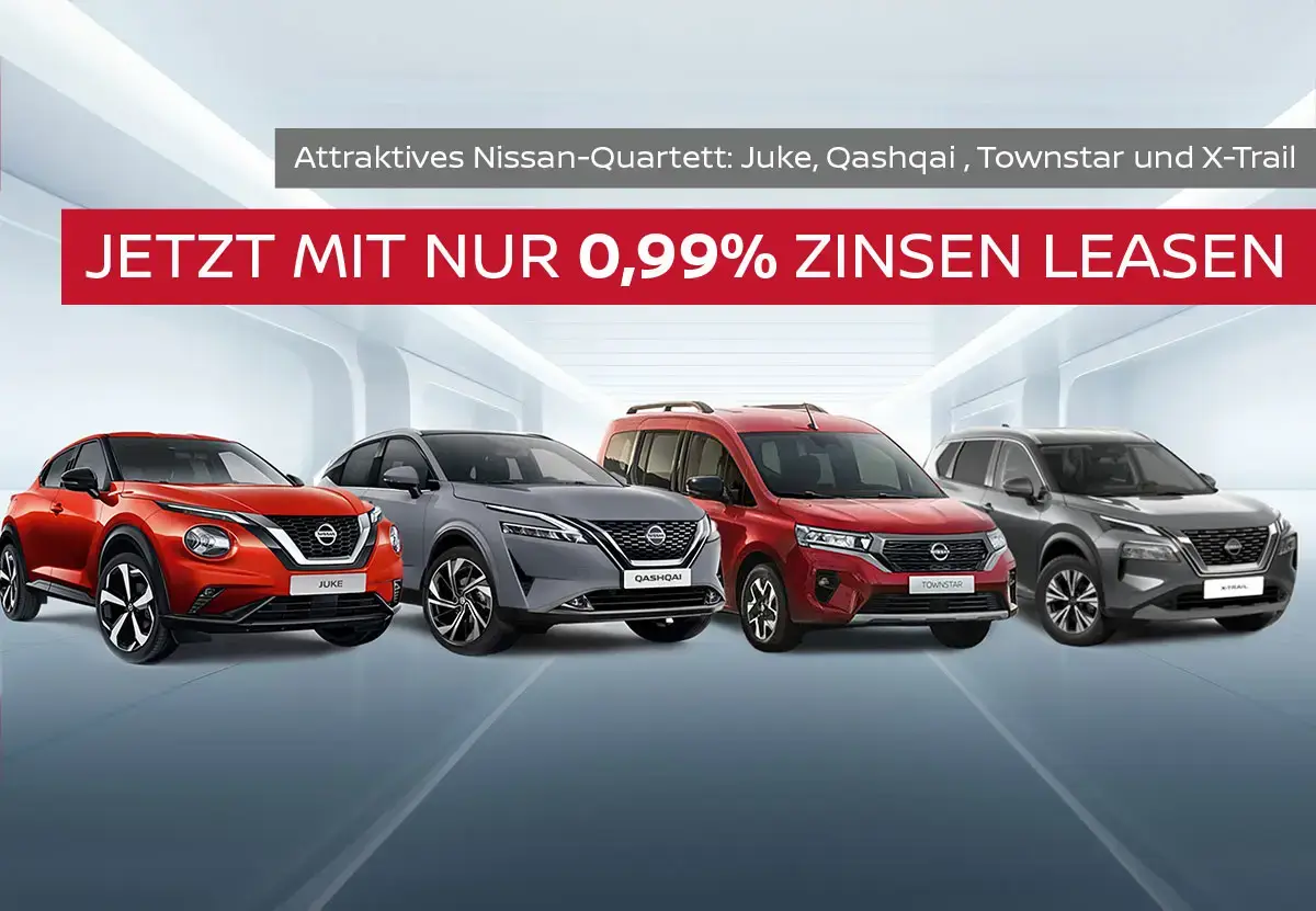 Jetzt ist die per­fek­te Zeit, um in ei­nen neu­en Nis­san ein­zu­stei­gen. Ab so­fort kön­nen Sie die Mo­del­le Qas­h­qai e‑POWER, Juke Hy­brid, X‑Trail e‑POWER und Town­star Kom­bi mit ei­nem sor­gen­frei­en Lea­sing-An­ge­bot ge­nie­ßen: