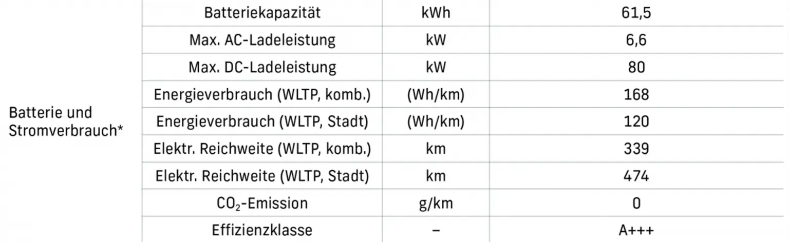 | Reichweite Elektrische Reichweite (WLTP) | 474km (Stadtverkehr), 339km (kombiniert) |