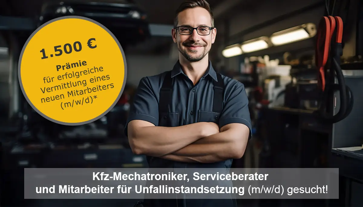Sie ken­nen je­man­den mit ei­ner pas­sen­den Qua­li­fi­ka­ti­on – z. B. ei­ner ab­ge­schlos­se­nen Be­rufs­aus­bil­dung im Kfz-Be­reich oder Er­fah­rung im Werk­statt­ser­vice? Dann freu­en wir uns über Ih­ren Hin­weis! Ob Freund, Nach­bar oder Fa­mi­li­en­mit­glied – wenn Ihre Emp­feh­lung zum neu­en Kol­le­gen oder zur neu­en Kol­le­gin wird, be­dan­ken wir uns mit ei­ner Ver­mitt­lungs­prä­mie von 1.500 €.*